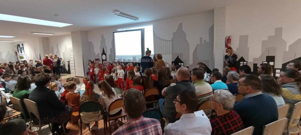 W dniu 22.12.2023r. zostaliśmy zaproszeni na wspólne śpiewanie - kolędowanie do sąsiadującej z nami Szkoły Podstawowej im. T. Kościuszki w Turowie. W trakcie spotkania, przedszkolaki z grupy ,,Tygryski", w imieniu całej społeczności szkoły wręczyli dla każdego z nas kartki z życzeniami świątecznymi. Tym samym zrobili nam bardzo miłą niespodziankę. Ponadto podziwialiśmy piekną dekorację - zimowe miasteczko, które składa się z mnóstwa elementów grających, świecących, jeżdżacych.